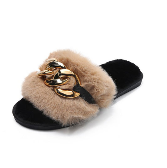 Flat Sandals Furry Women's Sandals Soft Fur Slippers Sandals Fur Indoor Slides With Large Gold Chain